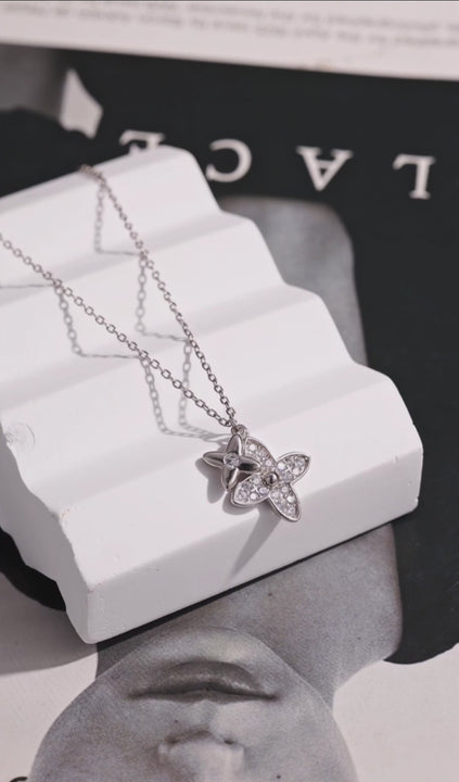 “A graceful blend of sparkle and simplicity, this necklace features two dainty flower motifs that capture light beautifully. Perfectly balanced and irresistibly feminine, it adds a touch of refined charm to everyday looks.”